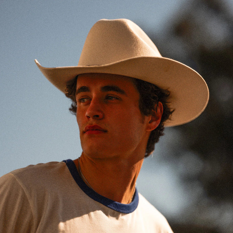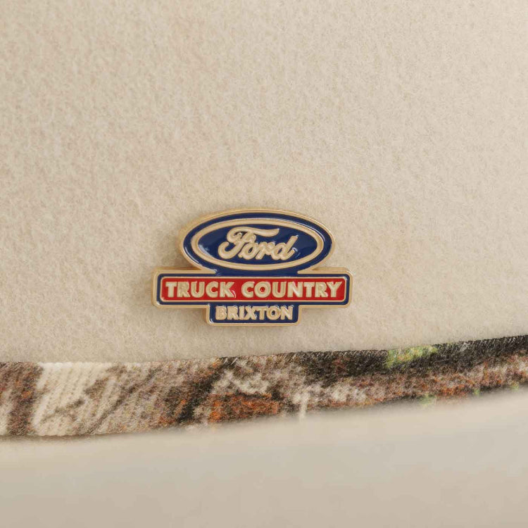 The Brixton Ford Truck Country Cowboy Hat combines Ford's Detroit heritage with Brixton's coastal inspiration for a distinctive look. Crafted from 100% wool felt, it features a structured shape with a cattleman crown and a side roll brim measuring 9.8 cm. Designed for comfort and fit, it includes a moisture-wicking sweatband and an adjustable Velcro strap. The interior camo band adds a unique touch, while a Ford metal pin completes the authentic design. This hat offers classic country style with modern functionality, perfect for those seeking both tradition and contemporary appeal.