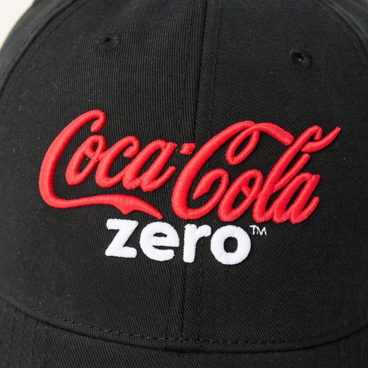 The American Needle Coca Cola Zero Ball Park Cap in black features a classic 6-panel, unstructured design for a relaxed fit. Crafted from 100% cotton, it offers breathable comfort and durability. The cap showcases detailed Coca Cola Zero embroidery on the front, delivering authentic brand appeal. An adjustable cloth strap ensures a customisable fit, making it both stylish and practical for everyday wear.