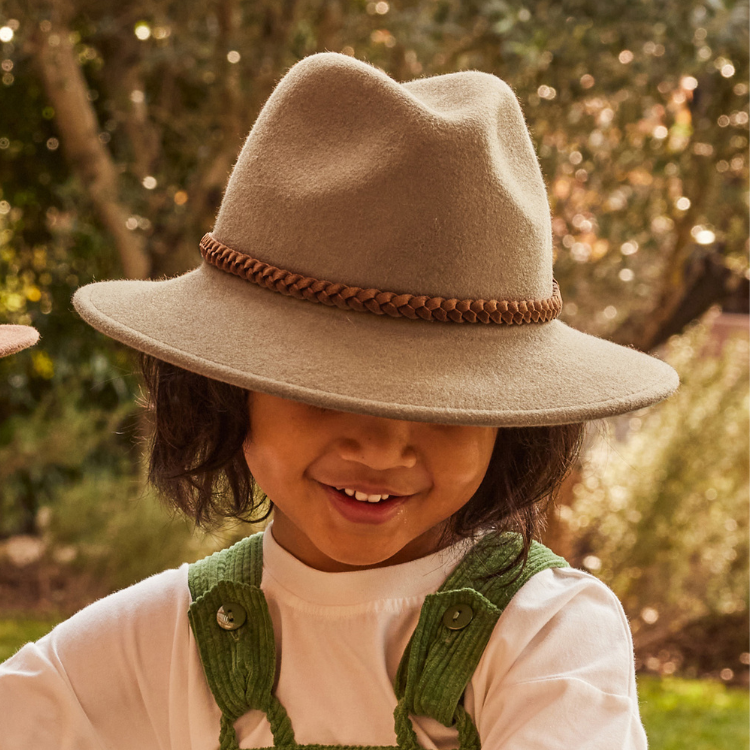Introduce your young fashion icon to the chic Cooroy Fedora from Cancer Council Kids. Crafted from luxurious wool felt, this fedora comes in versatile chocolate brown and camel shades. With a plaited faux leather band and a UPF50+ protection, this fedora is both stylish and functional.
