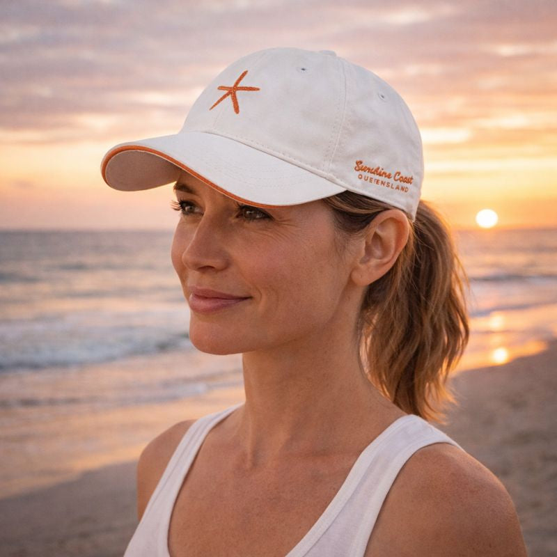 The Pacific Creations Ocean Star Cap in white features a detailed starfish embroidered on the front patch, showcasing fine craftsmanship. Made from 100% cotton, it offers breathable comfort and durability. The cloth strap rear adjustor ensures a customizable fit for most head sizes. Designed in Australia, this cap combines quality materials with thoughtful design for everyday wear.